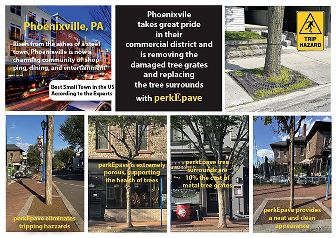 Recycling tires through the use of perkEpave eliminates the burning of tires for fuel and keeps discarded tires out of the land fill. The use of perkEpave for tree surrounds assures health of trees and eliminates tree root damaged sidewalks. Paving your sidewalks with perkEpave will eliminate tripping hazard.